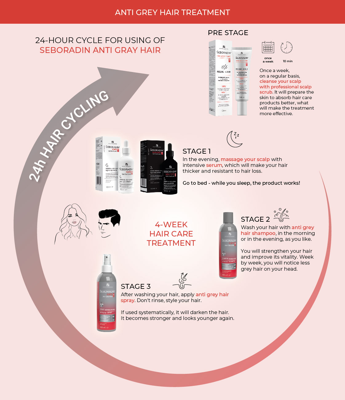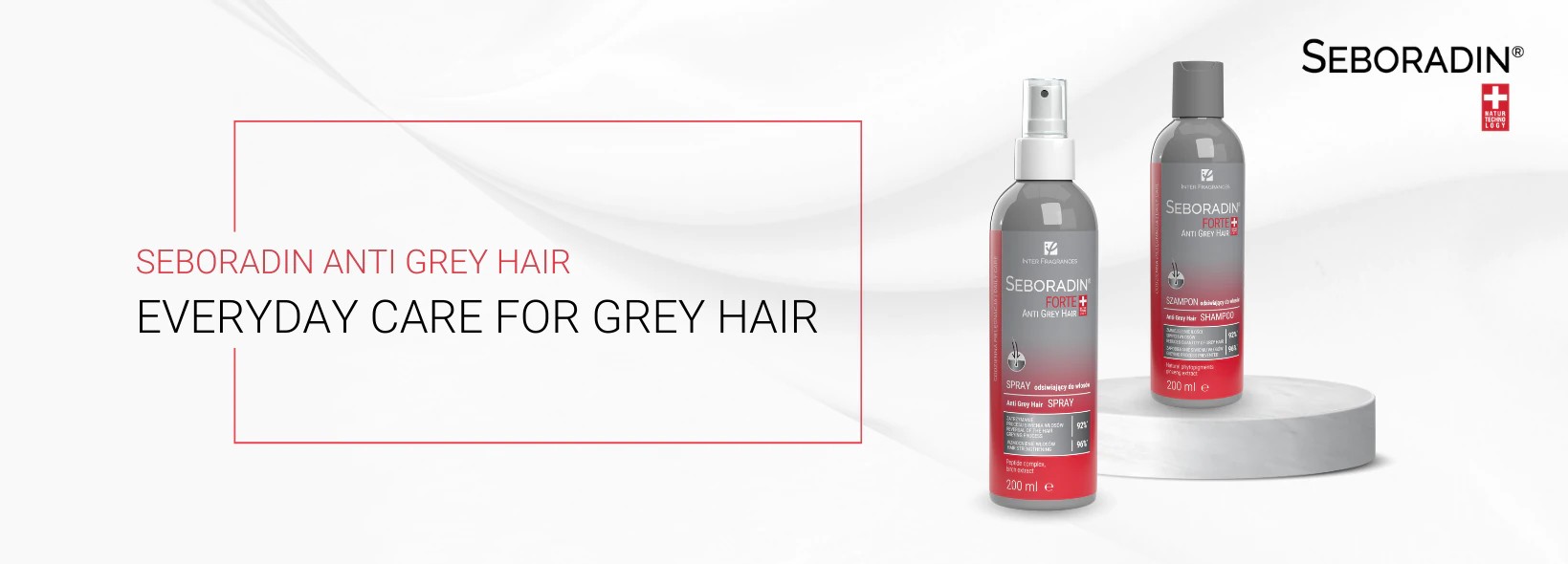 Seboradin ANTI GREY HAIR is a treatment recommended for both women and men. The series consists of two comprehensive hair care cosmetics – shampoo and spray. If used regularly since appearing the first signs of greying, products  brings out natural hair colour, making hair visibly darker. Due to the content of antioxidant substances, Seboradin ANTI GREY HAIR preparations are helpful in delaying aging processes of the hair and improve vitality and appearance of the hair.