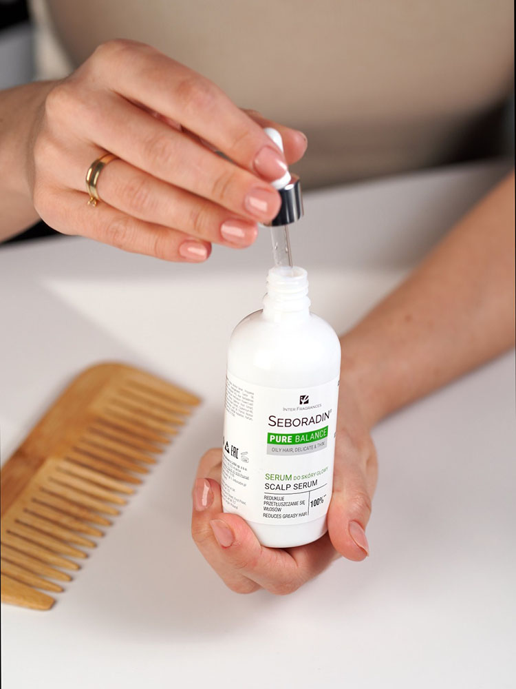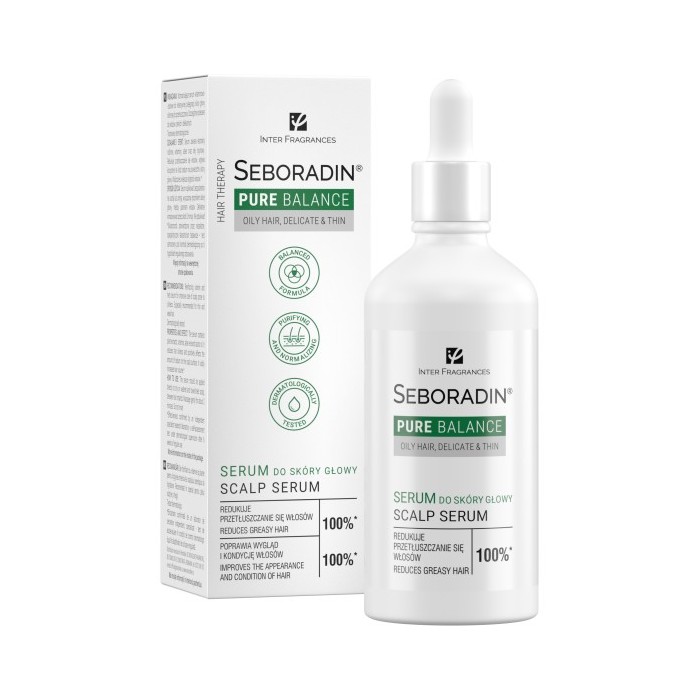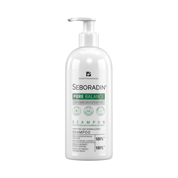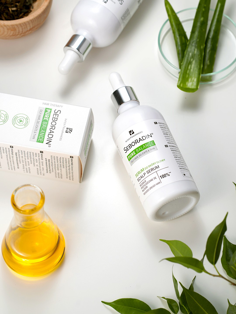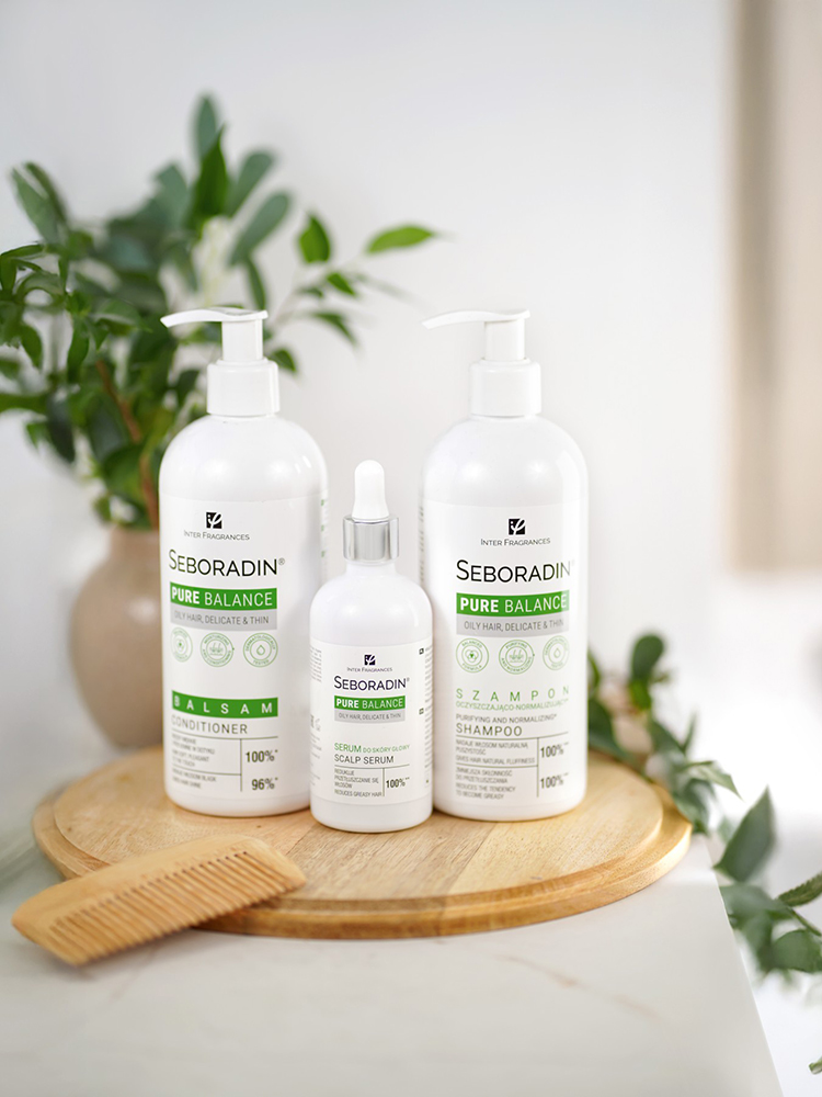 Zasadniczą rolą preparatów do włosów przetłuszczających się jest uregulowanie pracy gruczołów łojowych, jak również zapewnienie odpowiedniej pielęgnacji włosów na długości, unikając przy tym efektu obciążenia. Gama Seboradin PURE BALANCE składa się z trzech kosmetyków, których skuteczność zawdzięczamy składnikom, takim jak ekstrakty ziołowe (z kasztanowca, szałwii, skrzypu polnego, podbiału pospolitego, rozmarynu, pokrzywy, rumianku i melisy), inulina (prebiotyk), aloes, niacynamid czy oleje roślinne (jojoba, rycynowy), które znane są ze swych właściwości oczyszczających, normalizujących, przeciwzapalnych i pielęgnacyjnych.